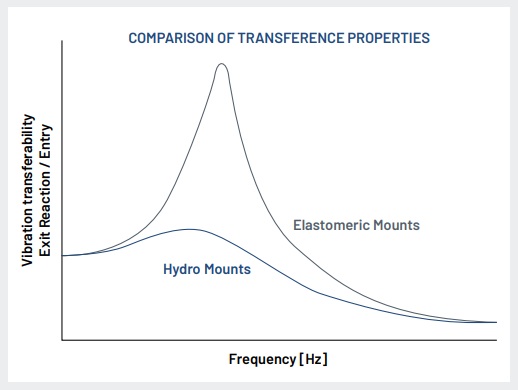 Hydro mounts combine elastomeric and viscous liquid damping technology to reduce cabin noise and vibration. The result is noticeable and demonstrably superior to conventional elastomeric mounts. Hydro mounts are versatile, since the mounts can be adapted precisely to the requirements at hand. Our customers benefit from a quieter workspace, less vibration and shocks inside the cabin, as well as lower costs due to the obsolescence of reinforcing material and welding points on the cabin.